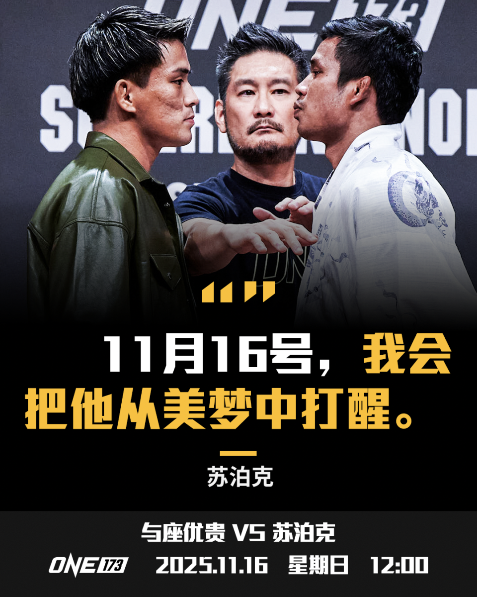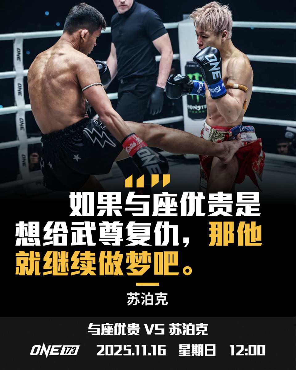 2025年11月16日,日本东京有明竞技场将迎来一场足以载入小级别踢拳史册的巅峰对决——现役ONE蝇量级踢拳世界冠军、被誉为“扫踢机器”的泰国传奇选手苏泊克,将在ONE173迎战日本本土超新星与座优贵。这场被业界视为当代小级别踢拳最高技术水准的较量,承载着两位顶尖拳手的荣耀与野心,也因苏泊克在赛前透露的强烈复仇欲望,成为全球拳迷瞩目的焦点。