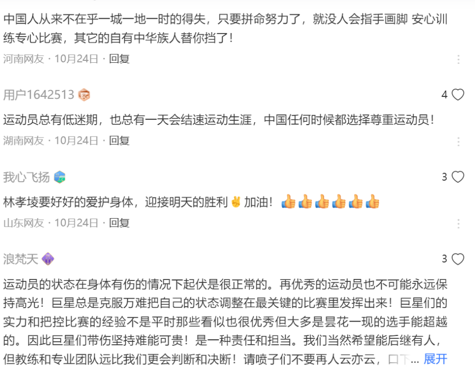 需要指出的是,这家韩国媒体的表达有失偏颇。在国内门户网站相关新闻的评论区中,绝大多数中国网友都对林孝埈表达了支持之声,并完全认可这位正在代表中国队备战比赛的选手是“真正的中国人”。有网友表示:“中国文化的包容性之强是韩国人无法想象的,我们从不会指责真正为国家做出贡献的人。”